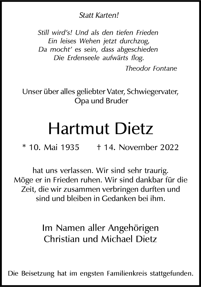 Hier finden Sie alle Traueranzeigen aus der Zeitung, die bisher für Hartmut Dietz erschienen sind. Weitere Traueranzeigen, die in der Zeitung erscheinen, werden hier ebenfalls aufgelistet