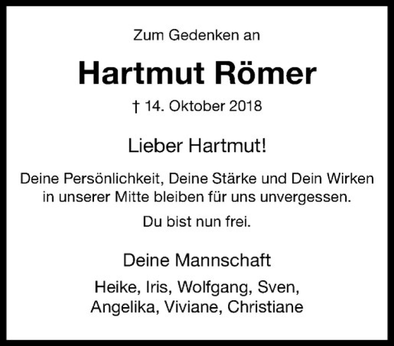 Hier finden Sie alle Traueranzeigen aus der Zeitung, die bisher für Hartmut Römer erschienen sind. Weitere Traueranzeigen, die in der Zeitung erscheinen, werden hier ebenfalls aufgelistet