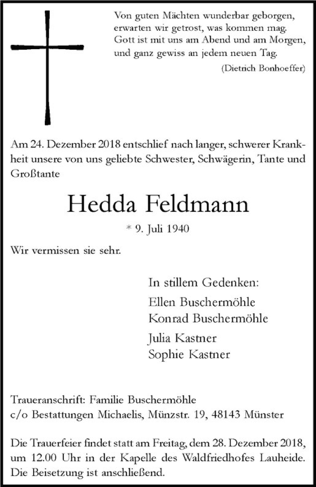 Hier finden Sie alle Traueranzeigen aus der Zeitung, die bisher für Hedda Feldmann erschienen sind. Weitere Traueranzeigen, die in der Zeitung erscheinen, werden hier ebenfalls aufgelistet