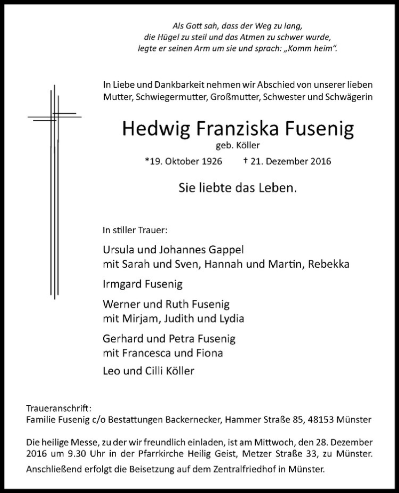 Hier finden Sie alle Traueranzeigen aus der Zeitung, die bisher für Hedwig Franziska Fusenig erschienen sind. Weitere Traueranzeigen, die in der Zeitung erscheinen, werden hier ebenfalls aufgelistet