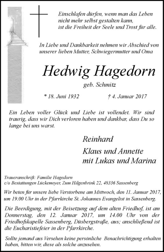 Hier finden Sie alle Traueranzeigen aus der Zeitung, die bisher für Hedwig Hagedorn erschienen sind. Weitere Traueranzeigen, die in der Zeitung erscheinen, werden hier ebenfalls aufgelistet