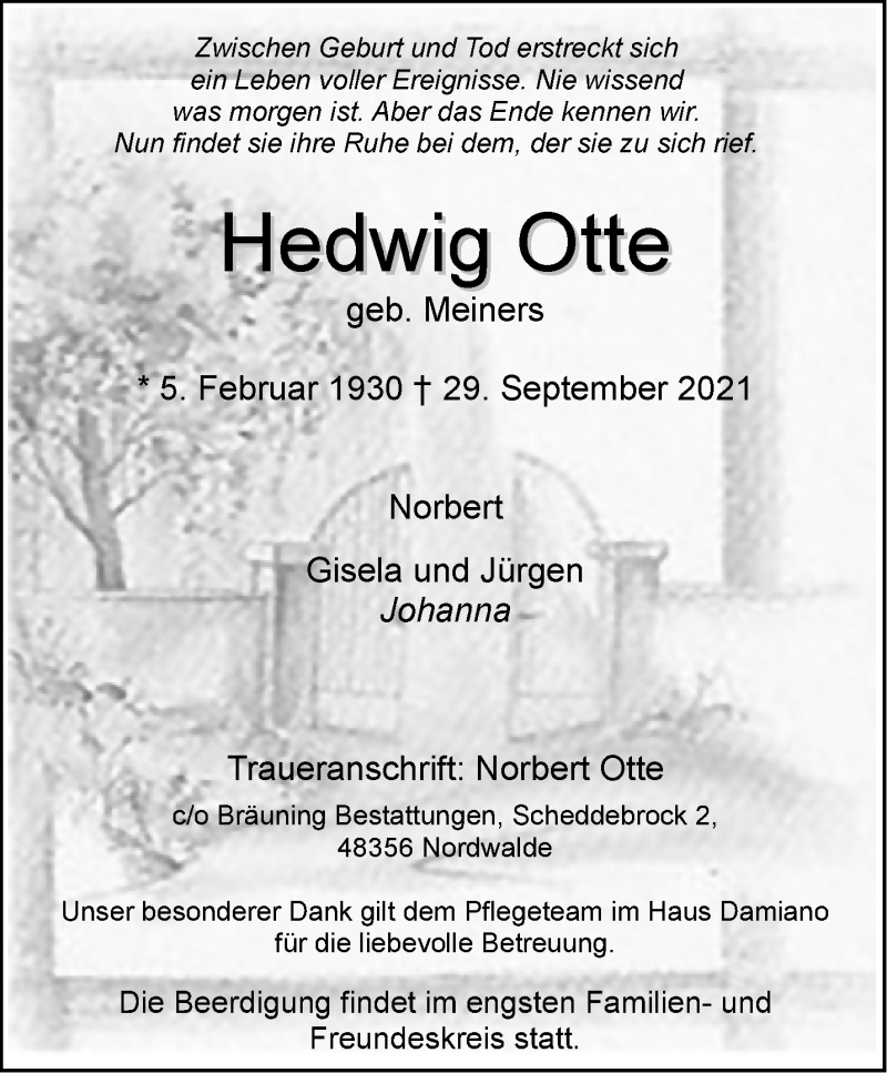 Hier finden Sie alle Traueranzeigen aus der Zeitung, die bisher für Hedwig Otte erschienen sind. Weitere Traueranzeigen, die in der Zeitung erscheinen, werden hier ebenfalls aufgelistet