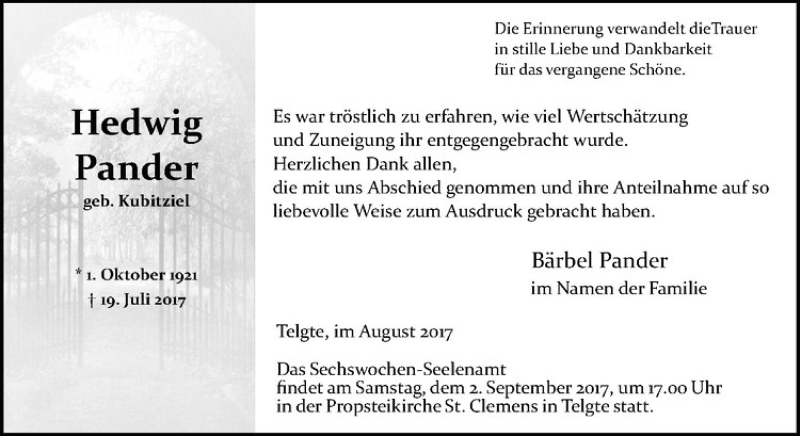 Hier finden Sie alle Traueranzeigen aus der Zeitung, die bisher für Hedwig Pander erschienen sind. Weitere Traueranzeigen, die in der Zeitung erscheinen, werden hier ebenfalls aufgelistet