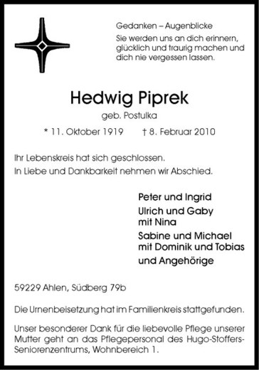 Hier finden Sie alle Traueranzeigen aus der Zeitung, die bisher für Hedwig Piprek erschienen sind. Weitere Traueranzeigen, die in der Zeitung erscheinen, werden hier ebenfalls aufgelistet