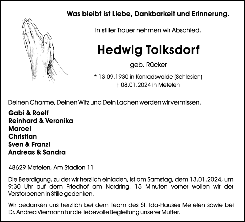 Hier finden Sie alle Traueranzeigen aus der Zeitung, die bisher für Hedwig Tolksdorf erschienen sind. Weitere Traueranzeigen, die in der Zeitung erscheinen, werden hier ebenfalls aufgelistet