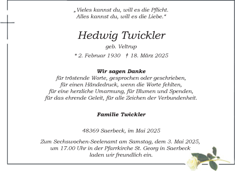 Hier finden Sie alle Traueranzeigen aus der Zeitung, die bisher für Hedwig Twickler erschienen sind. Weitere Traueranzeigen, die in der Zeitung erscheinen, werden hier ebenfalls aufgelistet