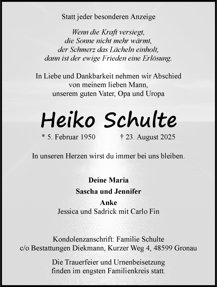 Hier finden Sie alle Traueranzeigen aus der Zeitung, die bisher für Heiko Schulte erschienen sind. Weitere Traueranzeigen, die in der Zeitung erscheinen, werden hier ebenfalls aufgelistet