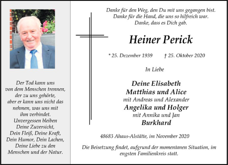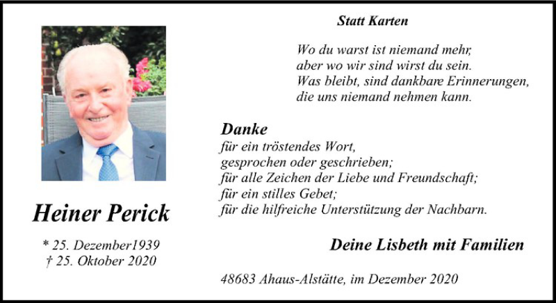 Hier finden Sie alle Traueranzeigen aus der Zeitung, die bisher für Heiner Perick erschienen sind. Weitere Traueranzeigen, die in der Zeitung erscheinen, werden hier ebenfalls aufgelistet