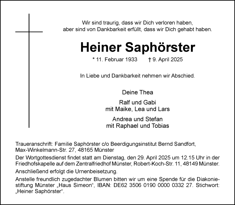 Hier finden Sie alle Traueranzeigen aus der Zeitung, die bisher für Heiner Saphörster erschienen sind. Weitere Traueranzeigen, die in der Zeitung erscheinen, werden hier ebenfalls aufgelistet