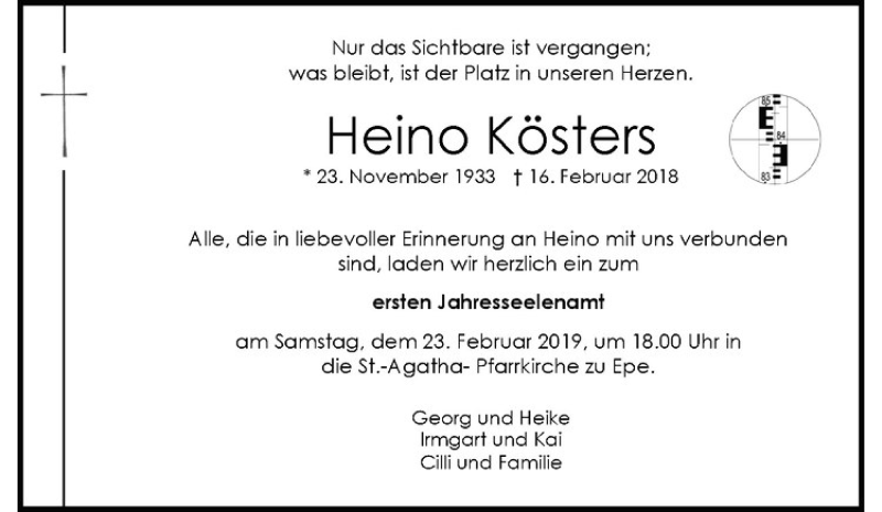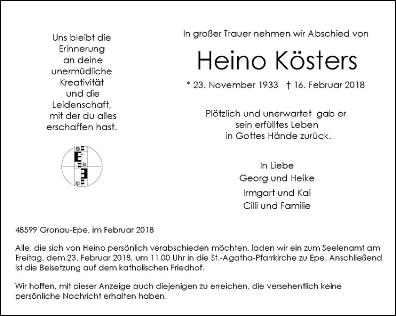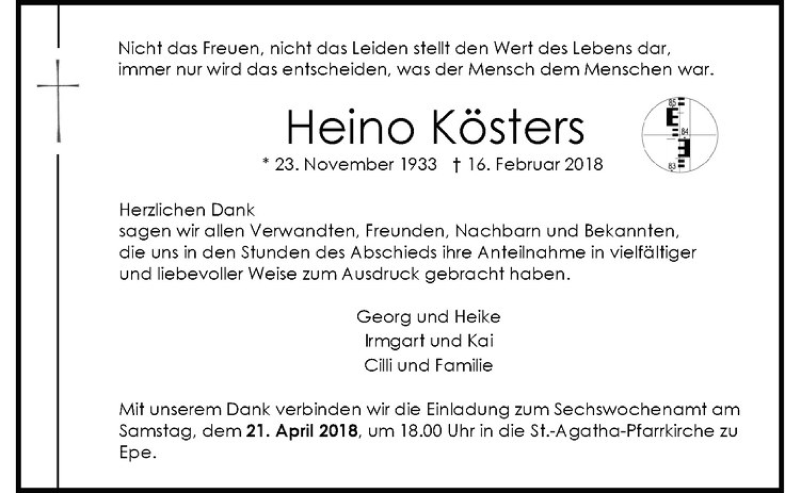 Hier finden Sie alle Traueranzeigen aus der Zeitung, die bisher für Heino Kösters erschienen sind. Weitere Traueranzeigen, die in der Zeitung erscheinen, werden hier ebenfalls aufgelistet