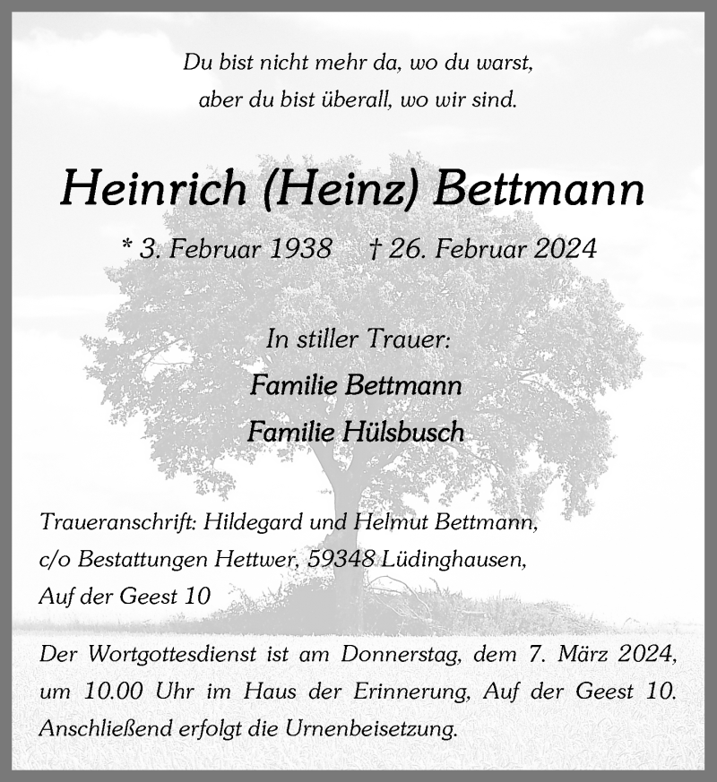 Hier finden Sie alle Traueranzeigen aus der Zeitung, die bisher für Heinrich Bettmann erschienen sind. Weitere Traueranzeigen, die in der Zeitung erscheinen, werden hier ebenfalls aufgelistet