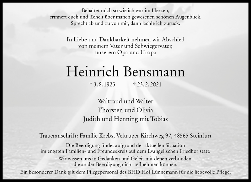 Hier finden Sie alle Traueranzeigen aus der Zeitung, die bisher für Heinrich Bensmann erschienen sind. Weitere Traueranzeigen, die in der Zeitung erscheinen, werden hier ebenfalls aufgelistet