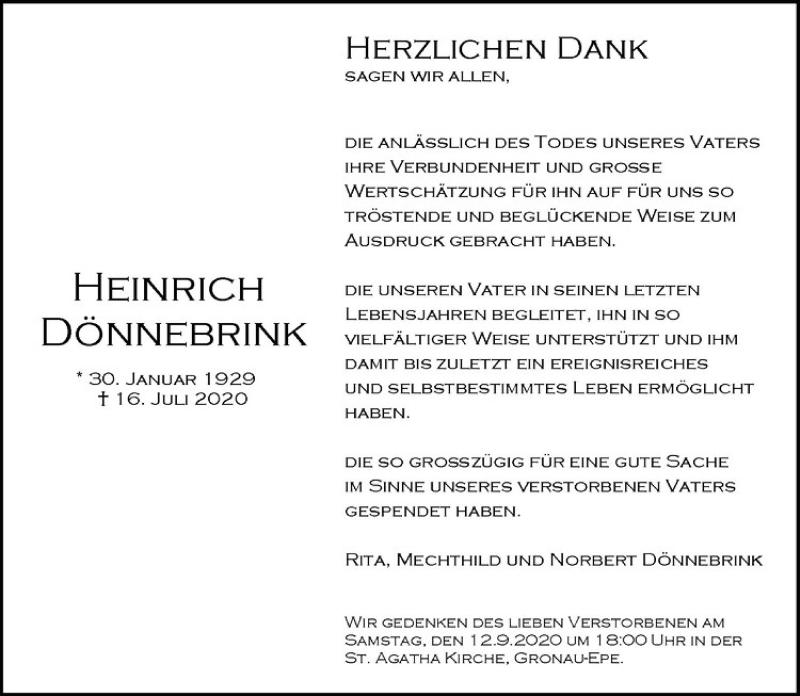 Hier finden Sie alle Traueranzeigen aus der Zeitung, die bisher für Heinrich Dönnebrink erschienen sind. Weitere Traueranzeigen, die in der Zeitung erscheinen, werden hier ebenfalls aufgelistet