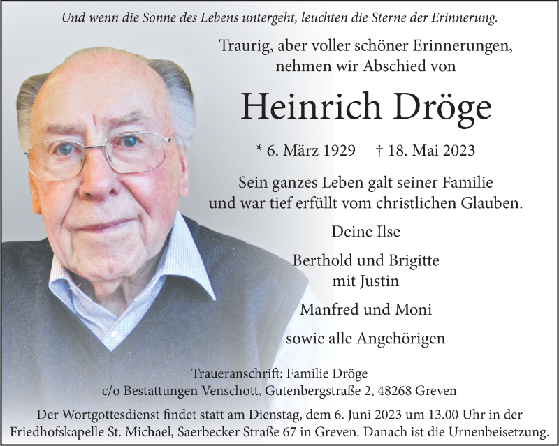 Hier finden Sie alle Traueranzeigen aus der Zeitung, die bisher für Heinrich Dröge erschienen sind. Weitere Traueranzeigen, die in der Zeitung erscheinen, werden hier ebenfalls aufgelistet