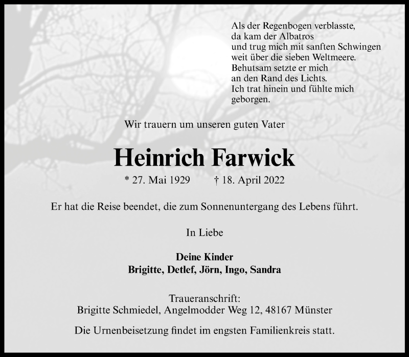 Hier finden Sie alle Traueranzeigen aus der Zeitung, die bisher für Heinrich Farwick erschienen sind. Weitere Traueranzeigen, die in der Zeitung erscheinen, werden hier ebenfalls aufgelistet
