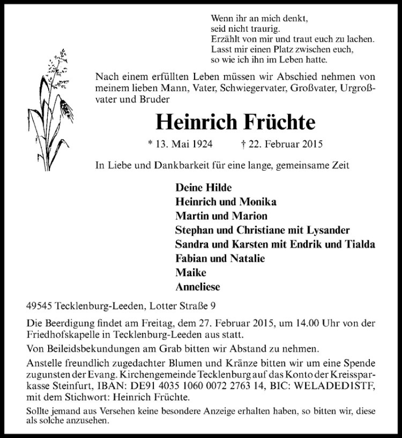 Hier finden Sie alle Traueranzeigen aus der Zeitung, die bisher für Heinrich Früchte erschienen sind. Weitere Traueranzeigen, die in der Zeitung erscheinen, werden hier ebenfalls aufgelistet