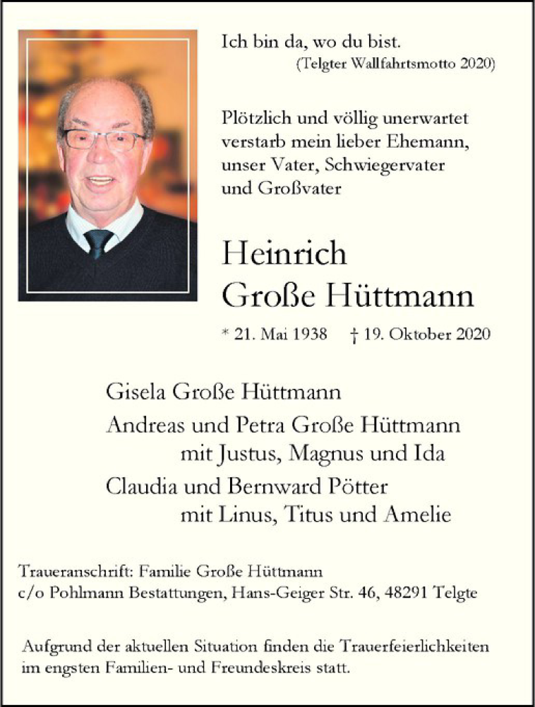 Hier finden Sie alle Traueranzeigen aus der Zeitung, die bisher für Heinrich Große Hüttmann erschienen sind. Weitere Traueranzeigen, die in der Zeitung erscheinen, werden hier ebenfalls aufgelistet