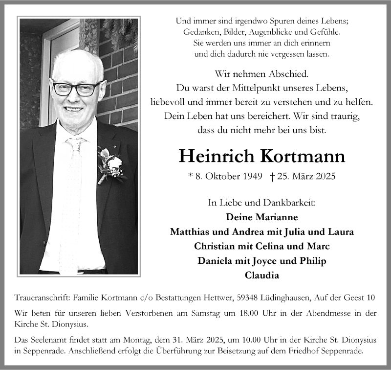 Hier finden Sie alle Traueranzeigen aus der Zeitung, die bisher für Heinrich Kortmann erschienen sind. Weitere Traueranzeigen, die in der Zeitung erscheinen, werden hier ebenfalls aufgelistet