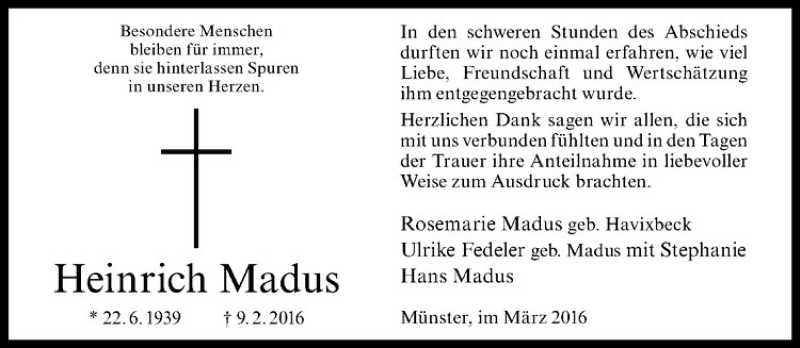 Hier finden Sie alle Traueranzeigen aus der Zeitung, die bisher für Heinrich Madus erschienen sind. Weitere Traueranzeigen, die in der Zeitung erscheinen, werden hier ebenfalls aufgelistet