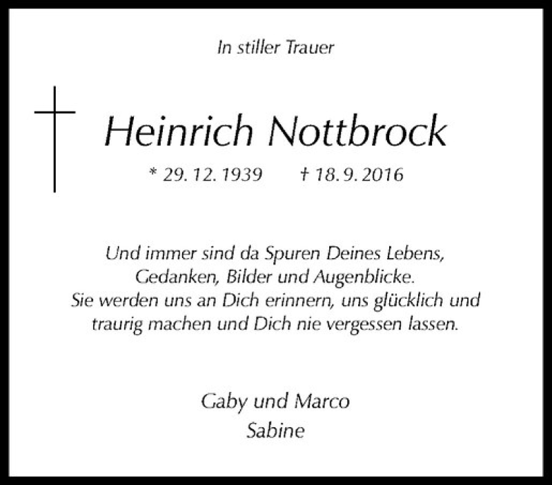 Hier finden Sie alle Traueranzeigen aus der Zeitung, die bisher für Heinrich Nottbrock erschienen sind. Weitere Traueranzeigen, die in der Zeitung erscheinen, werden hier ebenfalls aufgelistet