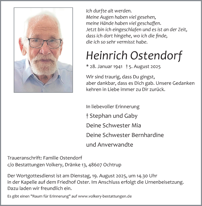 Hier finden Sie alle Traueranzeigen aus der Zeitung, die bisher für Heinrich Ostendorf erschienen sind. Weitere Traueranzeigen, die in der Zeitung erscheinen, werden hier ebenfalls aufgelistet