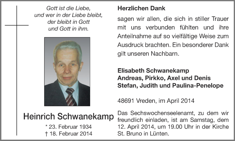 Hier finden Sie alle Traueranzeigen aus der Zeitung, die bisher für Heinrich Schwanekamp erschienen sind. Weitere Traueranzeigen, die in der Zeitung erscheinen, werden hier ebenfalls aufgelistet