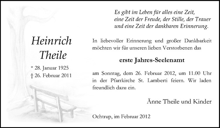 Hier finden Sie alle Traueranzeigen aus der Zeitung, die bisher für Heinrich Theile erschienen sind. Weitere Traueranzeigen, die in der Zeitung erscheinen, werden hier ebenfalls aufgelistet