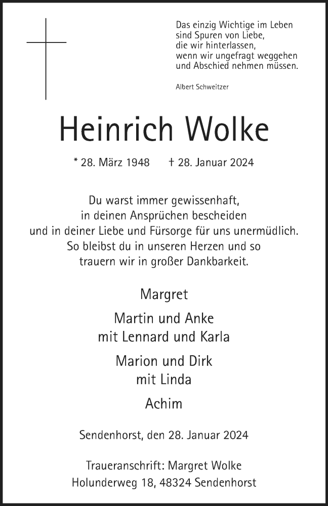 Hier finden Sie alle Traueranzeigen aus der Zeitung, die bisher für Heinrich Wolke erschienen sind. Weitere Traueranzeigen, die in der Zeitung erscheinen, werden hier ebenfalls aufgelistet