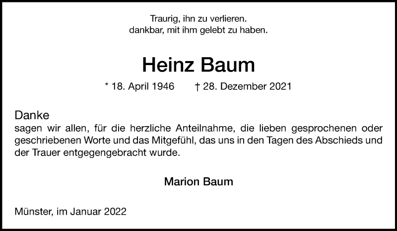 Hier finden Sie alle Traueranzeigen aus der Zeitung, die bisher für Heinz Baum erschienen sind. Weitere Traueranzeigen, die in der Zeitung erscheinen, werden hier ebenfalls aufgelistet