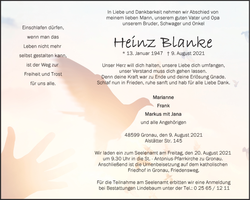 Hier finden Sie alle Traueranzeigen aus der Zeitung, die bisher für Heinz Blanke erschienen sind. Weitere Traueranzeigen, die in der Zeitung erscheinen, werden hier ebenfalls aufgelistet