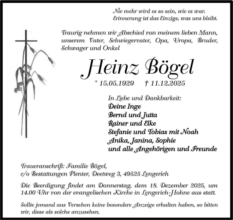 Hier finden Sie alle Traueranzeigen aus der Zeitung, die bisher für Heinz Bögel erschienen sind. Weitere Traueranzeigen, die in der Zeitung erscheinen, werden hier ebenfalls aufgelistet