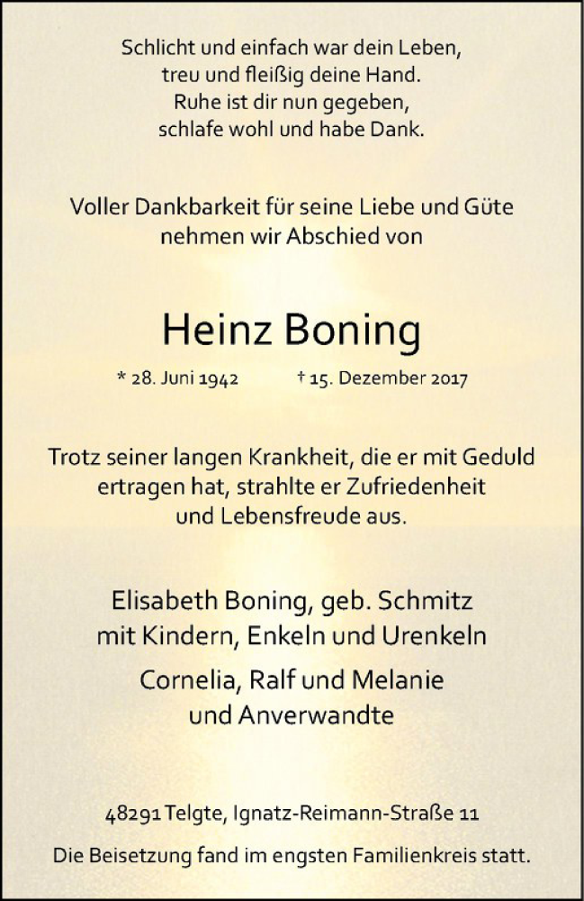 Hier finden Sie alle Traueranzeigen aus der Zeitung, die bisher für Heinz Boning erschienen sind. Weitere Traueranzeigen, die in der Zeitung erscheinen, werden hier ebenfalls aufgelistet