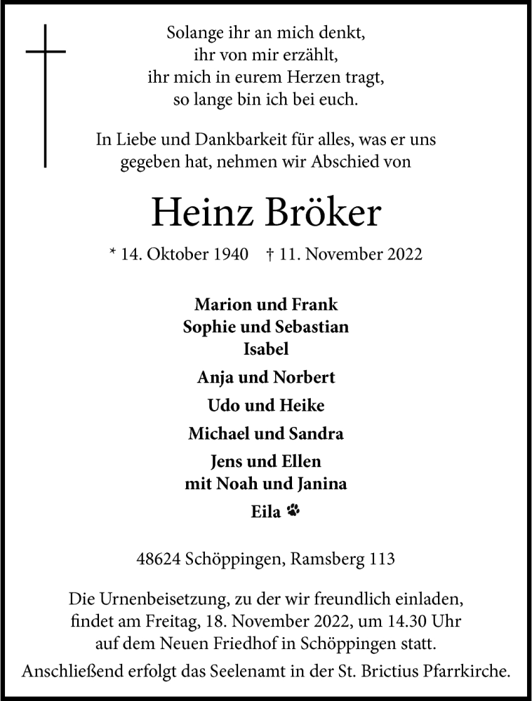 Hier finden Sie alle Traueranzeigen aus der Zeitung, die bisher für Heinz Bröker erschienen sind. Weitere Traueranzeigen, die in der Zeitung erscheinen, werden hier ebenfalls aufgelistet