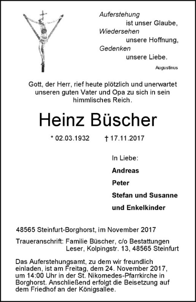 Hier finden Sie alle Traueranzeigen aus der Zeitung, die bisher für Heinz Büscher erschienen sind. Weitere Traueranzeigen, die in der Zeitung erscheinen, werden hier ebenfalls aufgelistet