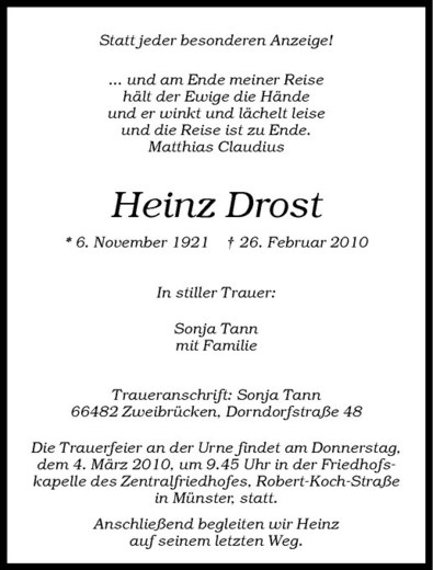 Hier finden Sie alle Traueranzeigen aus der Zeitung, die bisher für Heinz Drost erschienen sind. Weitere Traueranzeigen, die in der Zeitung erscheinen, werden hier ebenfalls aufgelistet
