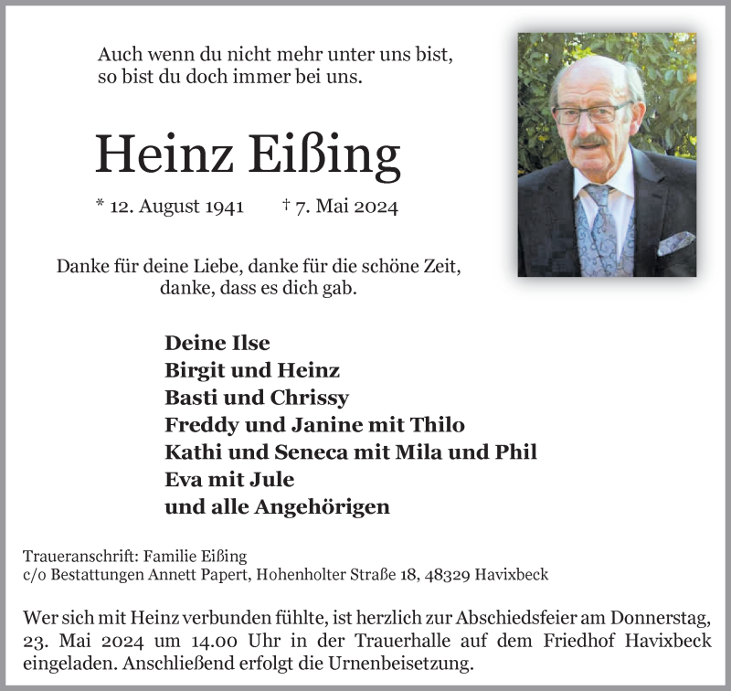 Hier finden Sie alle Traueranzeigen aus der Zeitung, die bisher für Heinz Eiing erschienen sind. Weitere Traueranzeigen, die in der Zeitung erscheinen, werden hier ebenfalls aufgelistet