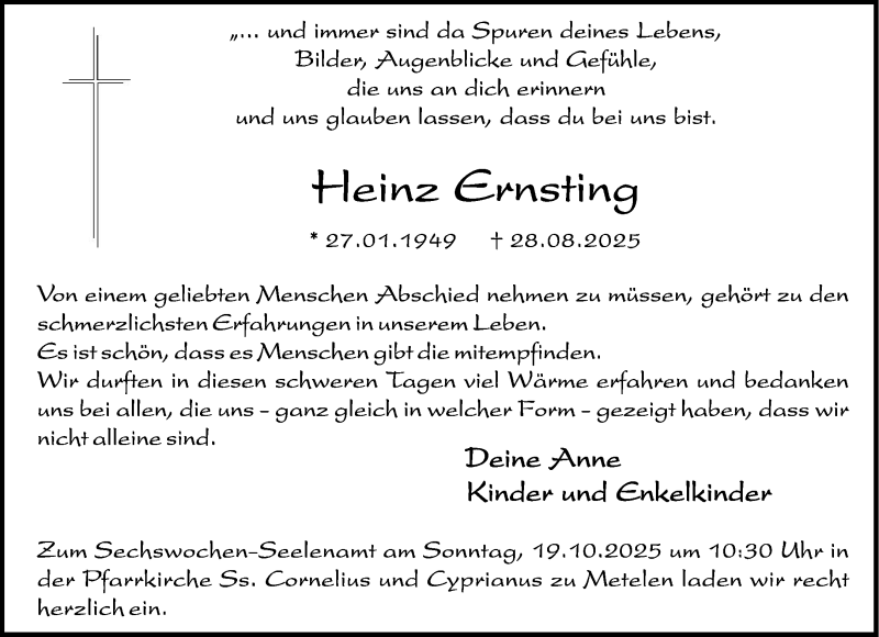 Hier finden Sie alle Traueranzeigen aus der Zeitung, die bisher für Heinz Ernsting erschienen sind. Weitere Traueranzeigen, die in der Zeitung erscheinen, werden hier ebenfalls aufgelistet