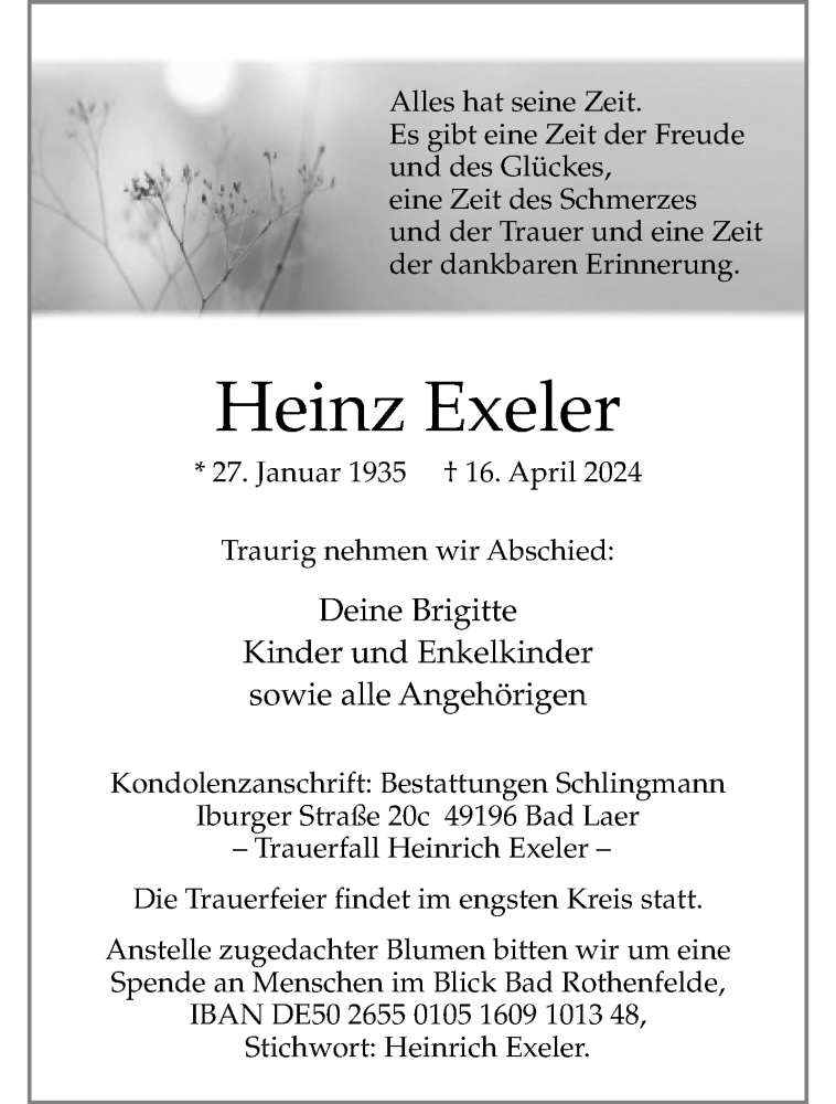 Hier finden Sie alle Traueranzeigen aus der Zeitung, die bisher für Heinz Exeler erschienen sind. Weitere Traueranzeigen, die in der Zeitung erscheinen, werden hier ebenfalls aufgelistet