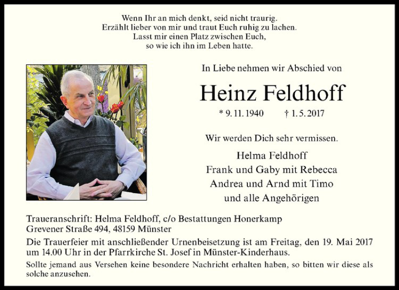 Hier finden Sie alle Traueranzeigen aus der Zeitung, die bisher für Heinz Feldhoff erschienen sind. Weitere Traueranzeigen, die in der Zeitung erscheinen, werden hier ebenfalls aufgelistet