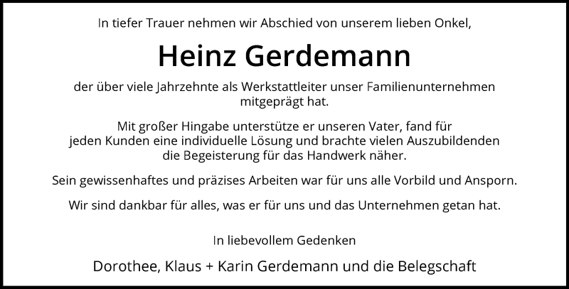 Hier finden Sie alle Traueranzeigen aus der Zeitung, die bisher für Heinz Gerdemann erschienen sind. Weitere Traueranzeigen, die in der Zeitung erscheinen, werden hier ebenfalls aufgelistet