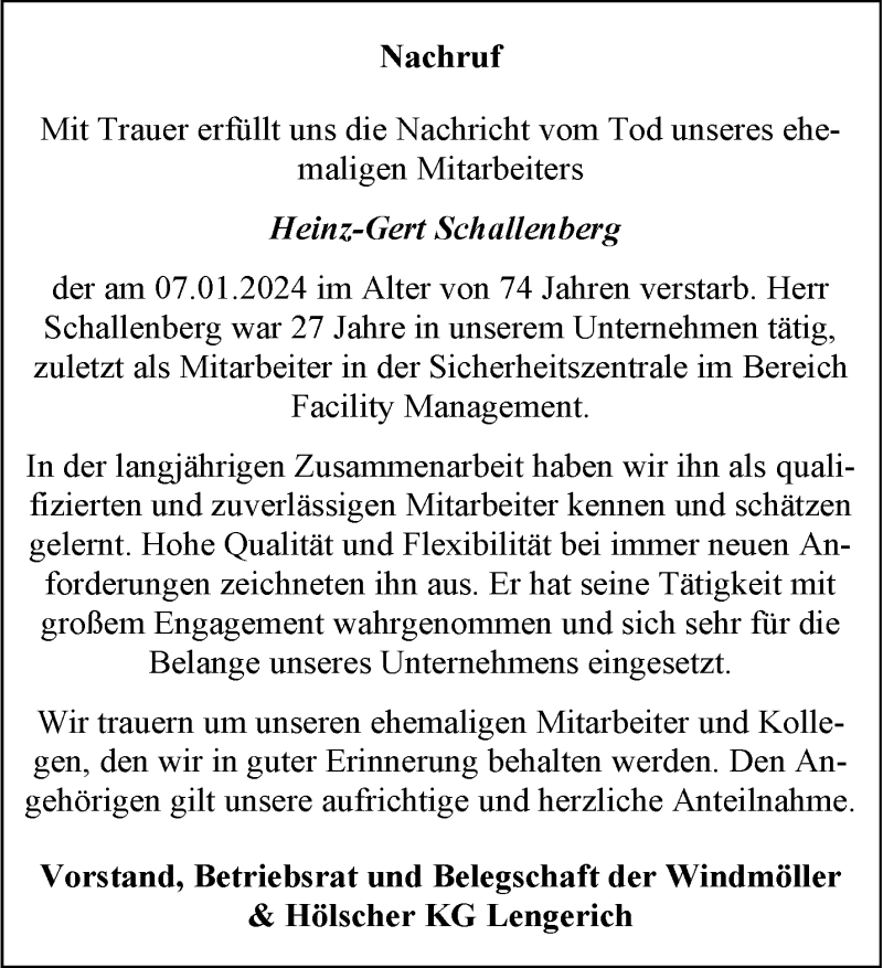 Hier finden Sie alle Traueranzeigen aus der Zeitung, die bisher für Heinz-Gert Schallenberg erschienen sind. Weitere Traueranzeigen, die in der Zeitung erscheinen, werden hier ebenfalls aufgelistet