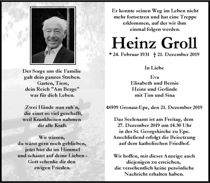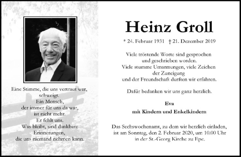 Hier finden Sie alle Traueranzeigen aus der Zeitung, die bisher für Heinz Groll erschienen sind. Weitere Traueranzeigen, die in der Zeitung erscheinen, werden hier ebenfalls aufgelistet