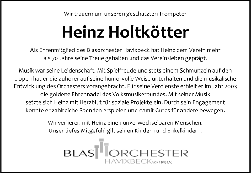 Hier finden Sie alle Traueranzeigen aus der Zeitung, die bisher für Heinz Holtkötter erschienen sind. Weitere Traueranzeigen, die in der Zeitung erscheinen, werden hier ebenfalls aufgelistet
