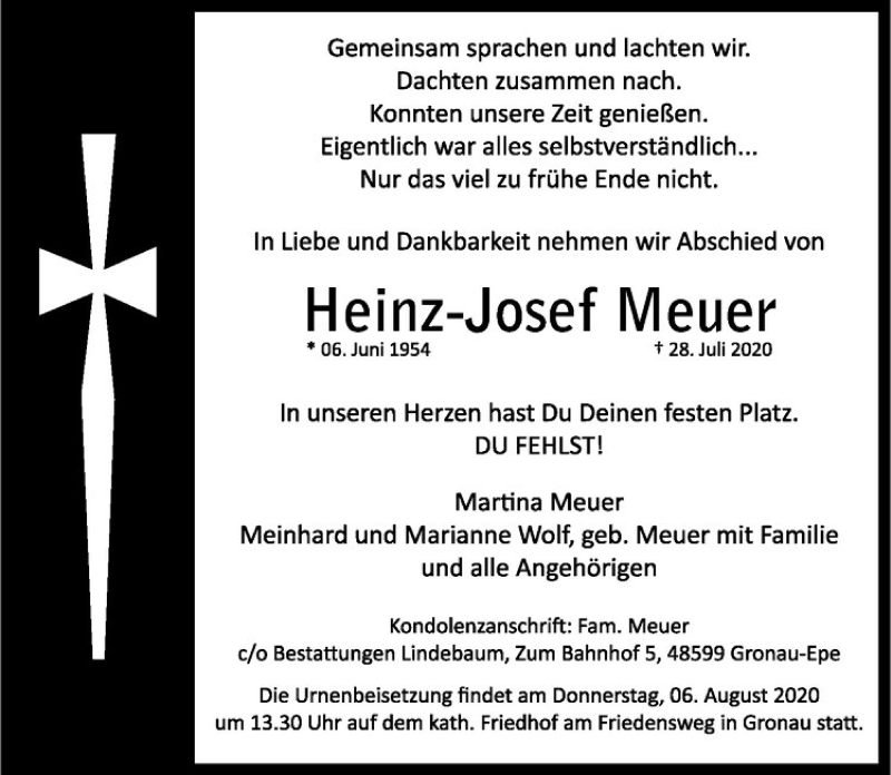 Hier finden Sie alle Traueranzeigen aus der Zeitung, die bisher für Heinz-Josef Meuer erschienen sind. Weitere Traueranzeigen, die in der Zeitung erscheinen, werden hier ebenfalls aufgelistet