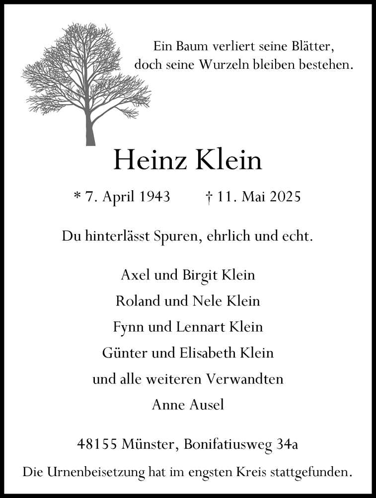 Hier finden Sie alle Traueranzeigen aus der Zeitung, die bisher für Heinz Klein erschienen sind. Weitere Traueranzeigen, die in der Zeitung erscheinen, werden hier ebenfalls aufgelistet