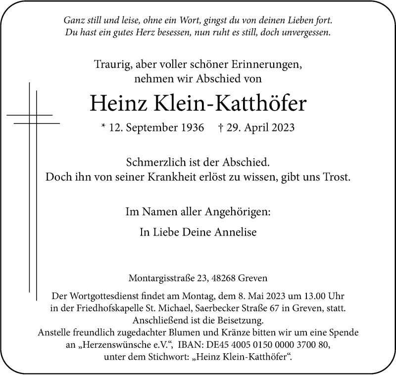 Hier finden Sie alle Traueranzeigen aus der Zeitung, die bisher für Heinz Klein-Katthöfer erschienen sind. Weitere Traueranzeigen, die in der Zeitung erscheinen, werden hier ebenfalls aufgelistet