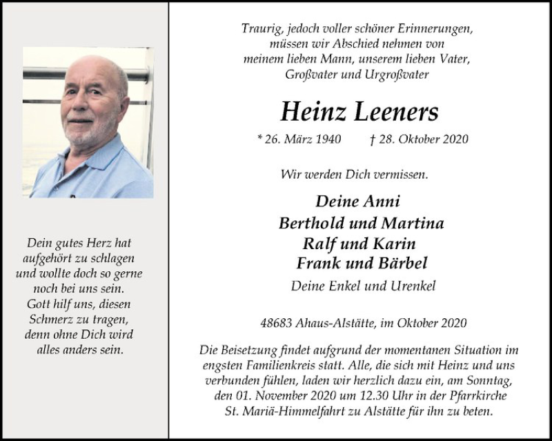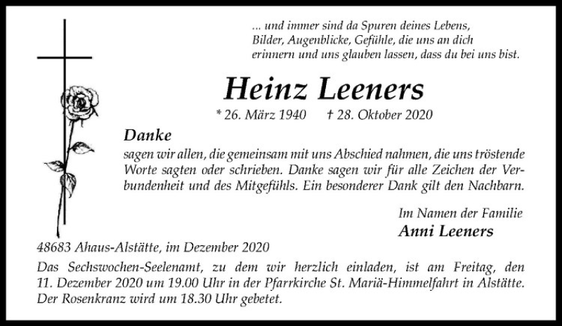 Hier finden Sie alle Traueranzeigen aus der Zeitung, die bisher für Heinz Leeners erschienen sind. Weitere Traueranzeigen, die in der Zeitung erscheinen, werden hier ebenfalls aufgelistet