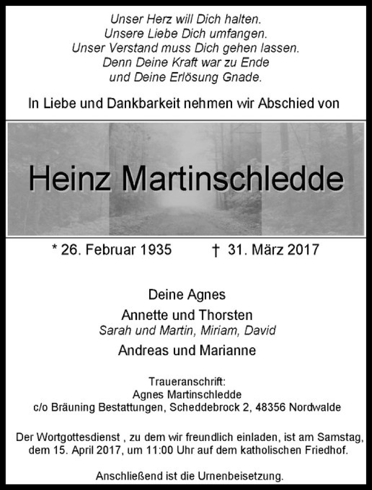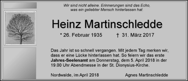 Hier finden Sie alle Traueranzeigen aus der Zeitung, die bisher für Heinz Martinschledde erschienen sind. Weitere Traueranzeigen, die in der Zeitung erscheinen, werden hier ebenfalls aufgelistet