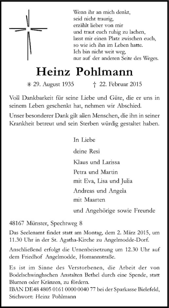 Hier finden Sie alle Traueranzeigen aus der Zeitung, die bisher für Heinz Pohlmann erschienen sind. Weitere Traueranzeigen, die in der Zeitung erscheinen, werden hier ebenfalls aufgelistet