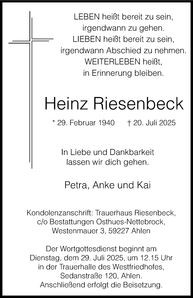 Hier finden Sie alle Traueranzeigen aus der Zeitung, die bisher für Heinz Riesenbeck erschienen sind. Weitere Traueranzeigen, die in der Zeitung erscheinen, werden hier ebenfalls aufgelistet